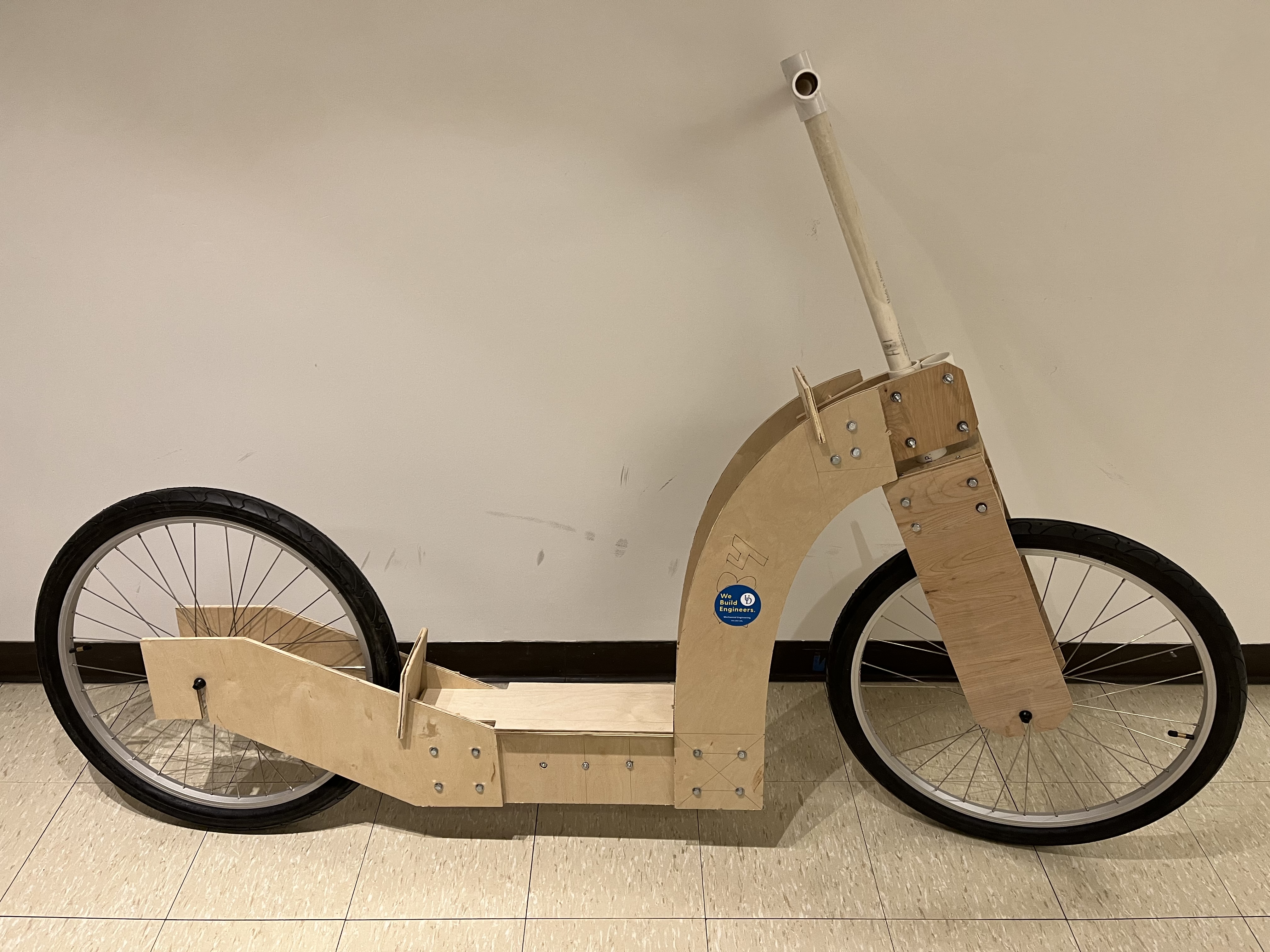 This class-wide competition involved the creation of a wooden push bike from a single sheet of plywood (4'x4'x1/2"), PVC pipe, hardware, and two bicycle tires. In addition to satisfying all desired project target values, the final design was sucessfully raced against other designs and was able to withstand the loads applied.