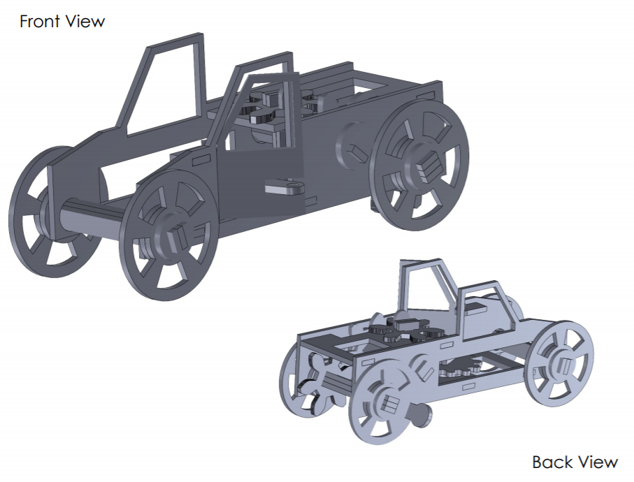 A wooden mechanical truck toy was created from a single laser cut piece of pinewood and features several mechanical motion elements such as a door swinging mechanism and a rotating light piece. The final design is composed of 24 unique pieces and was marketed towards college students as a stress relief fidget toy with a fun and challenging assembly process.