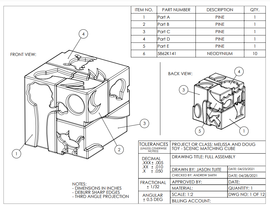 Melissa and DougĀ® sponsored project to create a novel toy for children ages 10 to 20 months old. Key objectives of this toy were to make an educational design while building on association and critical thinking skills. The final design was compliant with ASTM 963-11 standards and features a wooden block design of various scenes and cut patterns.