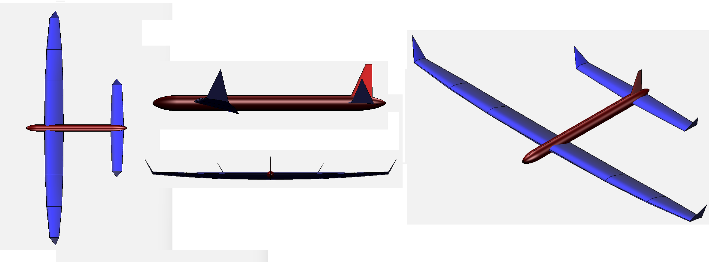 This project featured a class-wide competition for the best aerodynamic glider design. Success of the glider was divided into three seperate categories: endurance (total duration of flight), range (maximum horizontal distance travelled before landing), and altitude (maximum altitude reached during flight). Each glider was subject to several constraints such as the initial take off conditions (35 m/s takeoff at 20m height with 0deg angle of attack), body geometry (fixed fuselage and tail size and weight), and vehicle boundaries (maximum allowable wingspan width of 7m).