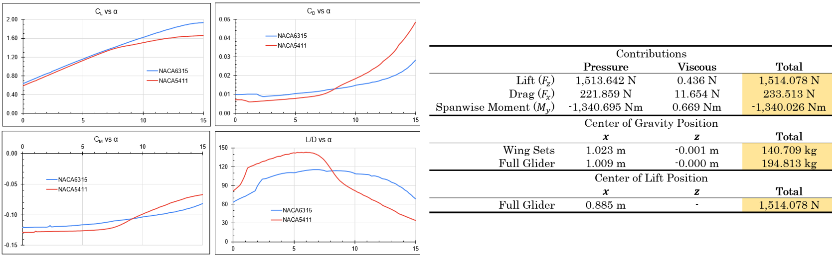The airfoil design was limited to NACA four-series airfoils as per the project constraints. As mentioned before, placing the center of lift closer to the fuselage of the glider greatly reduces the material needed to support the wings given the large lift moment (roll moment) that would have been created with a more uniform lift distribution. Therefore, airfoils with higher camber were desired near the fuselage, and more efficient airfoils (high L/D ratio) were desired near the tips of the wings. The airfoils used at the root (NACA6315) and tip (NACA5411) of the main wing set were compared using XFoil to simulate the flow across a range of attack angles. In addition to this larger camber, a higher L/D ratio was desired which was dependent upon the range of angles of attack the glider was expected to be subjected to based on preliminary analysis. For each section of the main wing set, as well as the tail wing, the L/D ratio was maximized while setting the lift coefficient to the amount needed for the desired lift distribution. This process involved several iterations, but results could be computed as shown below to quantify this process.
