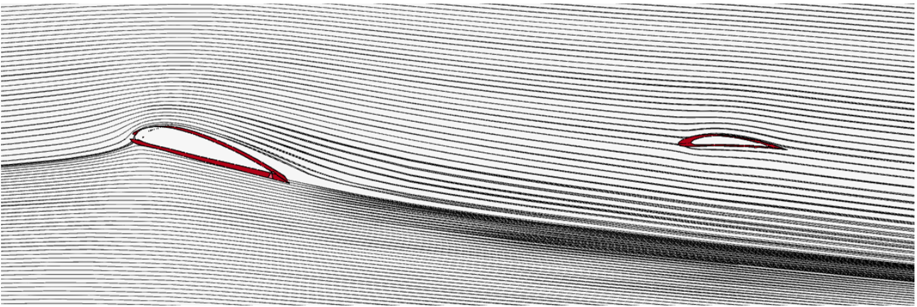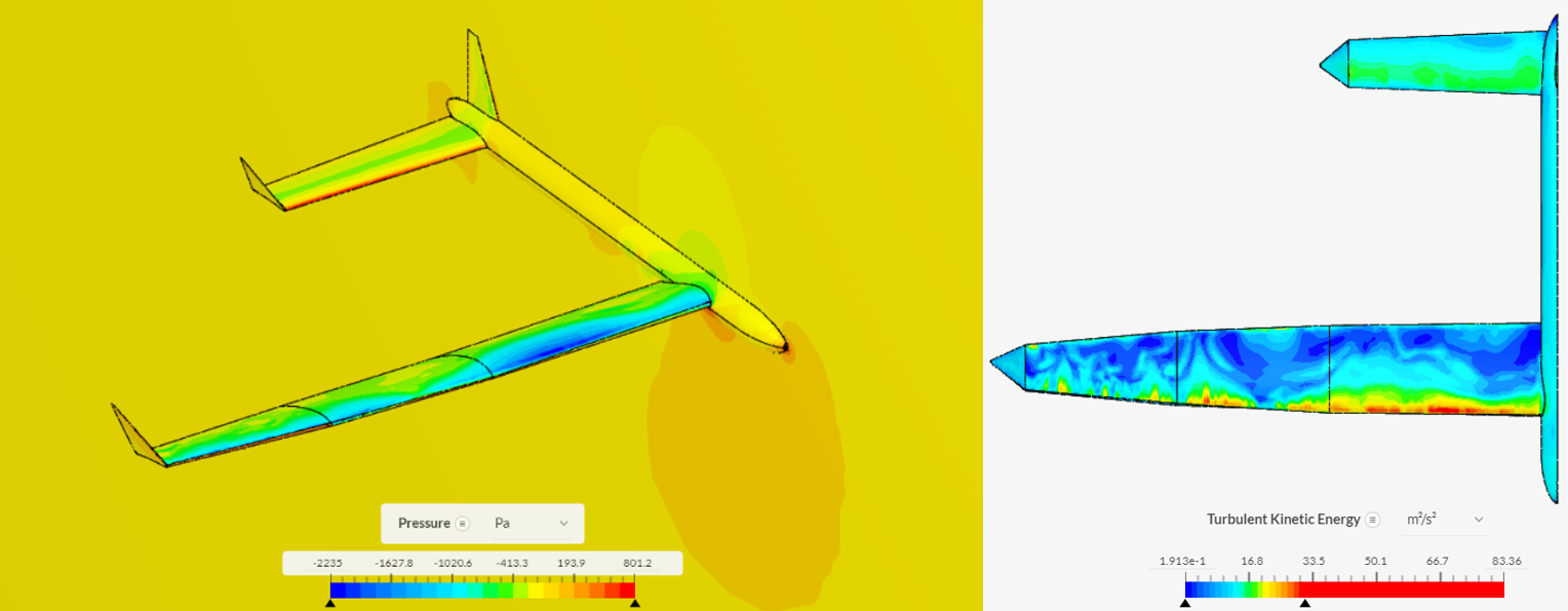 The performance of the glider was computed first using XFoil to simulate the 2D flow over each wing section to optimize the airfoil selection, then through VSPAero (vortex lattice method flow solver in OpenVSP) to confirm the previous analysis as well as predict the overall lift and drag performance, then finally through SimScale to get the most accurate 3D simulation result. During the iteration process, XFoil and VSPAero were utilized to minimize computation time and to fine tune several of the design parameters such as the airfoil selection, wing dimensions, and wing posiitons. This optimization can be observed in the peak performance of each airfoil occuring around a given angle of attack set by the wing section twist as shown before. The results of the final glider design shown above were calculated via SimScale using k-omega SST turbulence model as shown below.