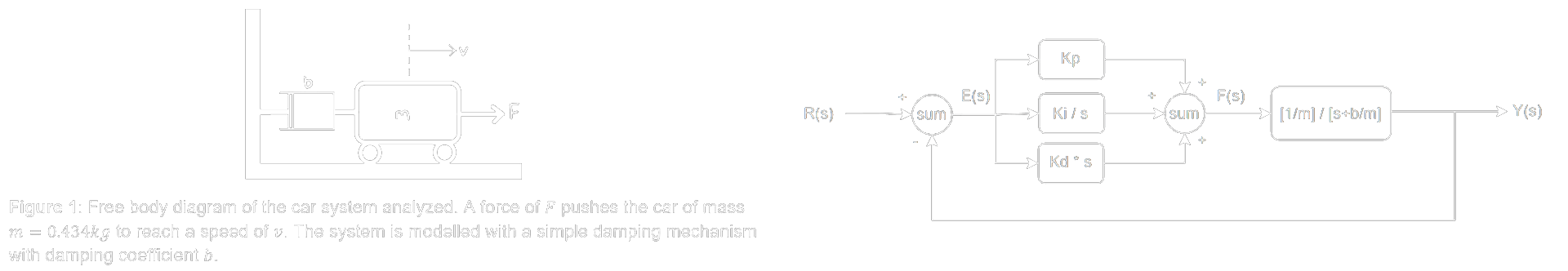 In order to create this PID controller, the system must first be modelled to understand the speed trajectory dynamics. For this, the car was assumed to operate similar to a dampened system which allows the driving force of the car to be related to the final speed output. With this, a first order differential equation was created relating the speed of the vehicle to input step response and various constant parameters such as the mass (m) and damping coefficient (b). Using Laplacian transforms, this differential equation was simplified to determine that the steady state velocity of the vehicle should approach v = F/b where F is the applied force.