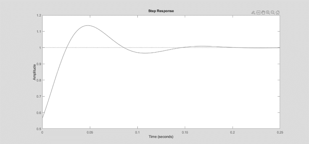 The gains found from before were first simulated in MATLAB to verify the accuracy of the approximations used. With an applied step input, the system had an overshoot of Mp = 13.65%, a settling time of ts = 0.14s, and a steady state error of 3.4% within the 0.25s domain analyzed. Note that the non-zero Ki term necessitates zero steady state error with a wider simulation domain.
